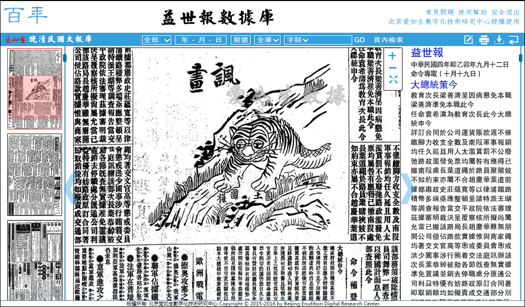 晚清民国大报库收录的益世报,自1915年10月1日创刊至1949年1月13日终刊,现存共8609号。