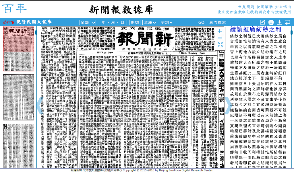 晚清民国大报库收录的新闻报,自1893年2月17日创刊至1949年5月停刊,现存共17520号。